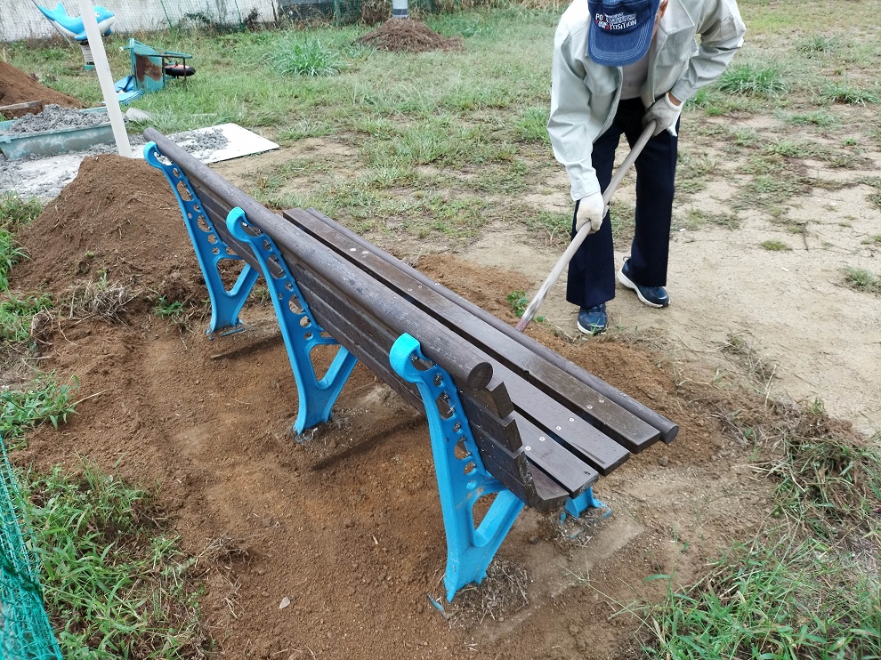 草刈り面積を減らす効果と、通行人が休めるベンチを作ることが目的です。